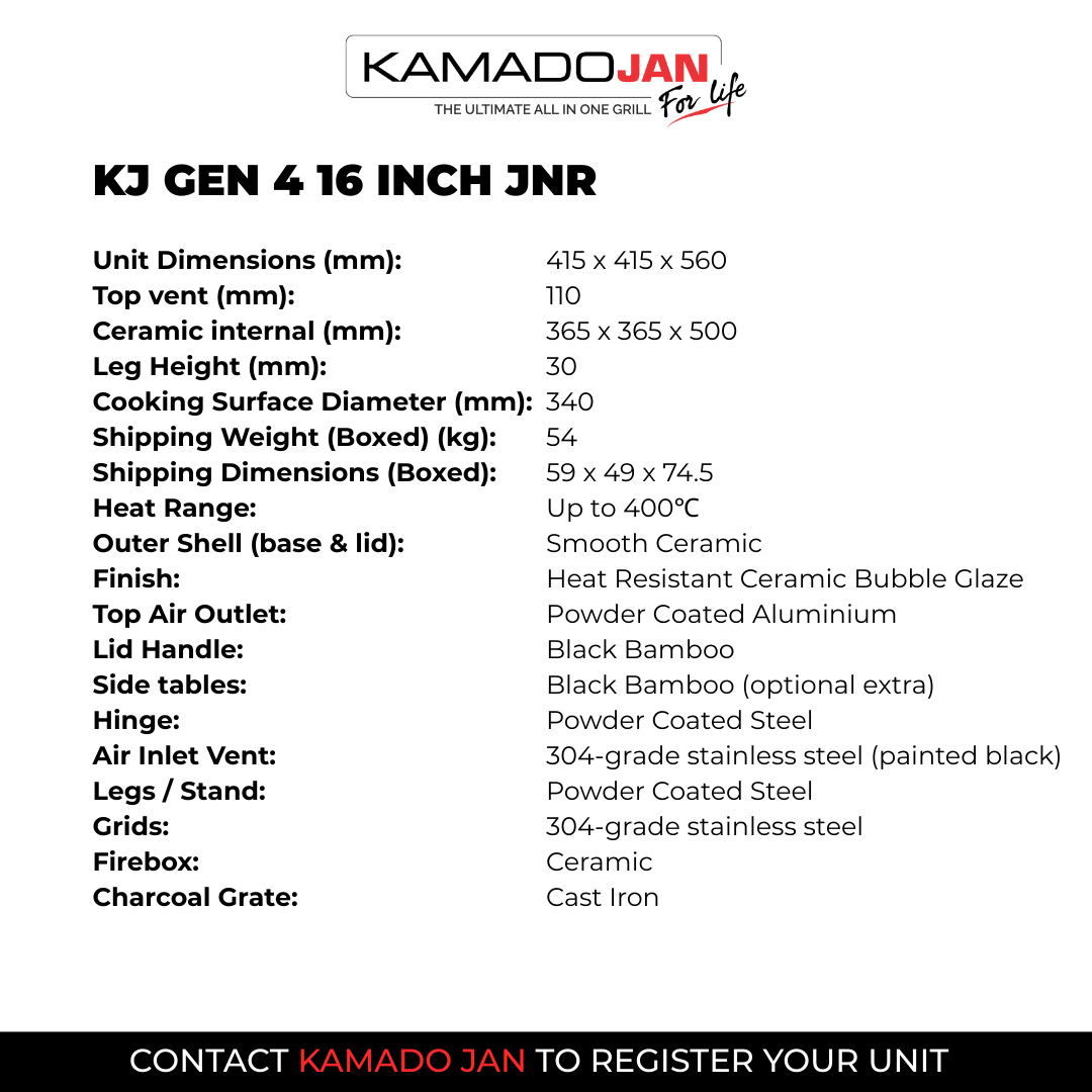 Anywhere, anytime. The JNR model offers all the advantages of Kamado grilling, packed into a model small enough to literally take anywhere, whether it’s a holiday at the beach, or a quick weekend getaway. Grill or sear your favourite cut of meat and even do a low-and-slow roast by inserting the heat deflector set for indirect cooking. The JNR features a 41cm ceramic diameter with a 34cm diameter cooking grid as well as all the basic accessories to get you going.