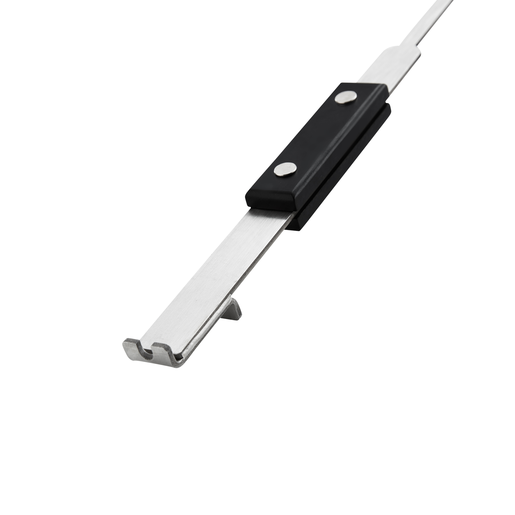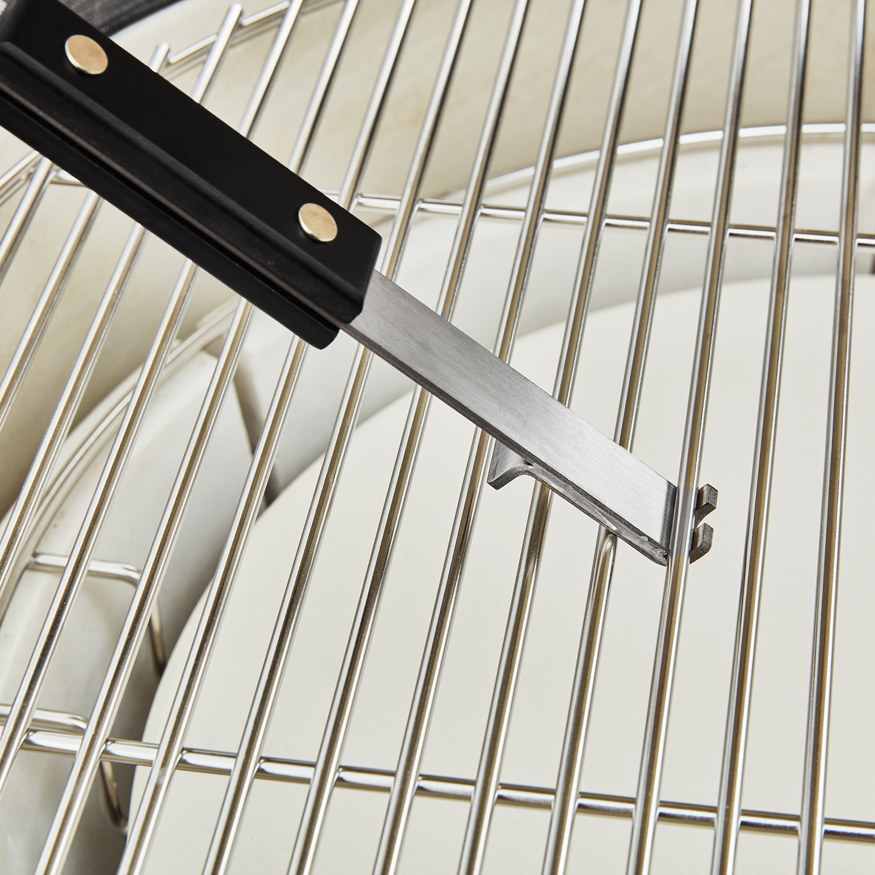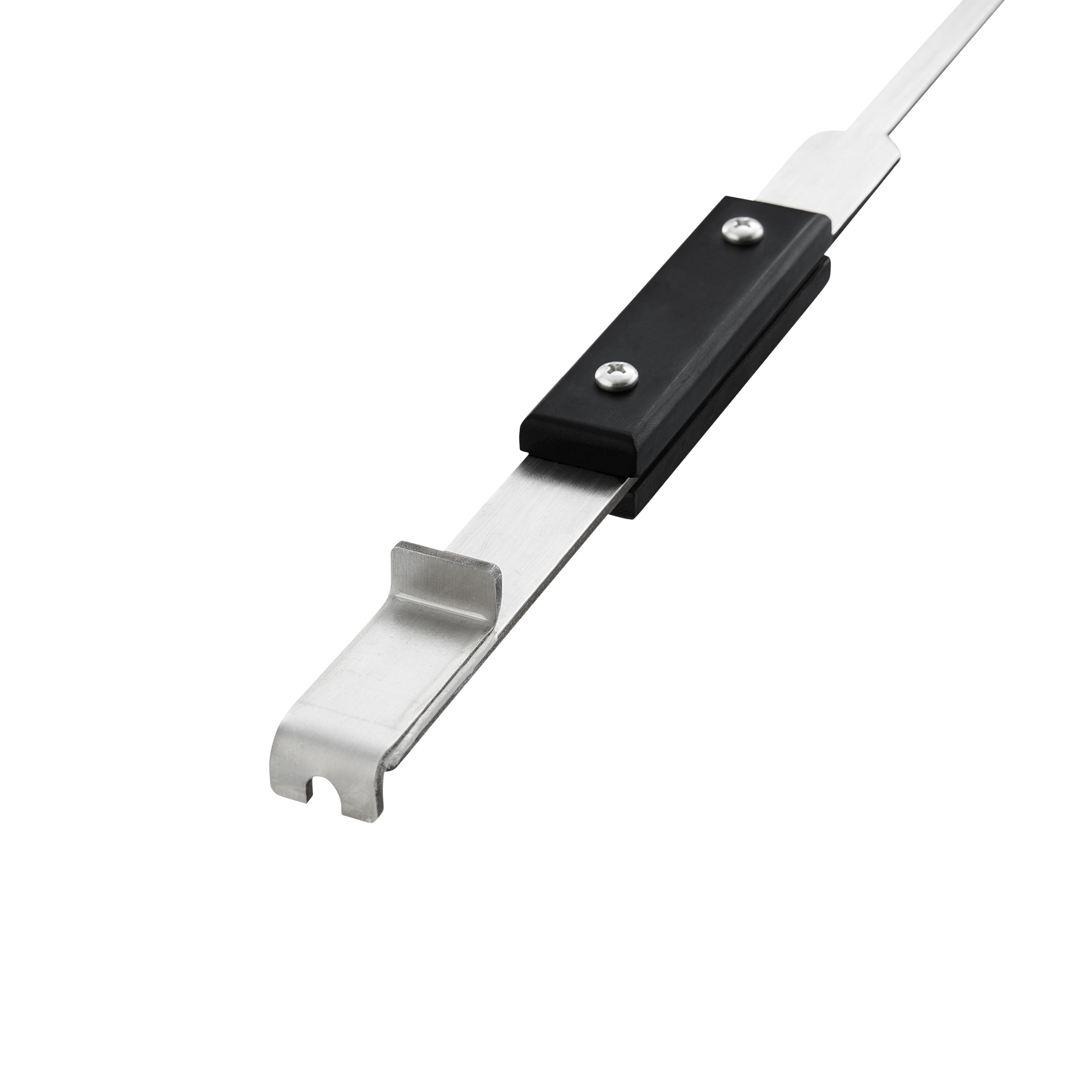 Made of 304-grade stainless steel with a painted black bamboo handle. Use one side of the tool to move coals or loosen ash from previous cooks. The dual-ended rear side allows you to lift grill grates or scrape them clean of grease and residue.